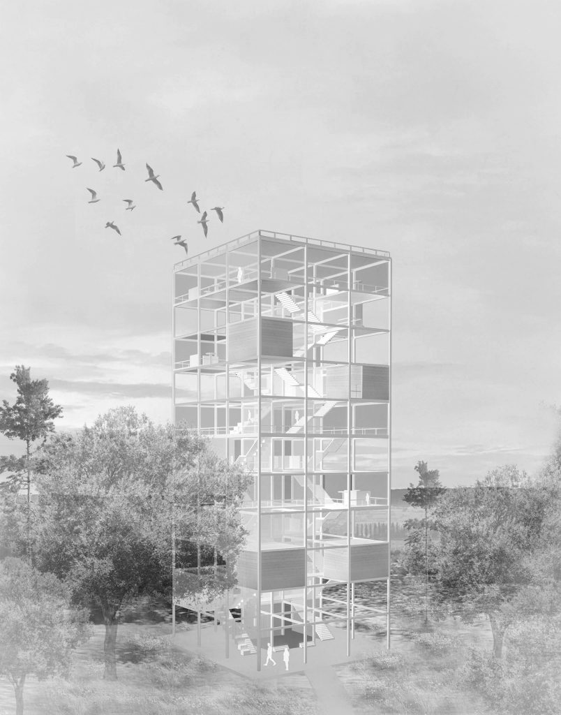Konzept frei.raum ist eine Vogelforschungsstation und Aussichtsturm auf der Reichenau. Herzstück des Entwurfs ist eine zentrale Voliere, die sich über die gesamte Höhe des Turms erstreckt und Vögeln sowie Besucher:innen Einblicke und Begegnungen ermöglicht. Geschützte Rückzugsbereiche und Plattformen verbinden Forschung, Ausstellung und Erlebnis, während Besucher die Vogelwelt hautnah erfahren können. Schlanke, klare Kuben und zurückhaltende Konstruktionen schaffen einen zeitlosen Rahmen für Arbeits- und Aufenthaltsbereiche von Wissenschaftlern und Besuchern. Sitzstufen und variierende Wege durch das Volierengeschoss machen Aufstieg und Aufenthalt zu einem visuellen und räumlichen Erlebnis. frei.raum vereint Natur, Wissenschaft und Architektur und inspiriert Menschen, die Vielfalt und Schönheit der Vogelwelt zu entdecken.